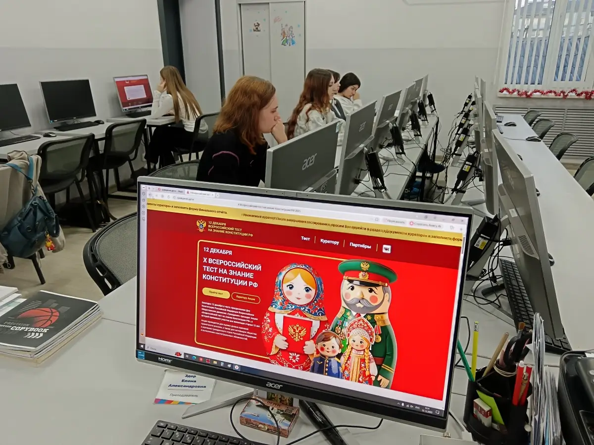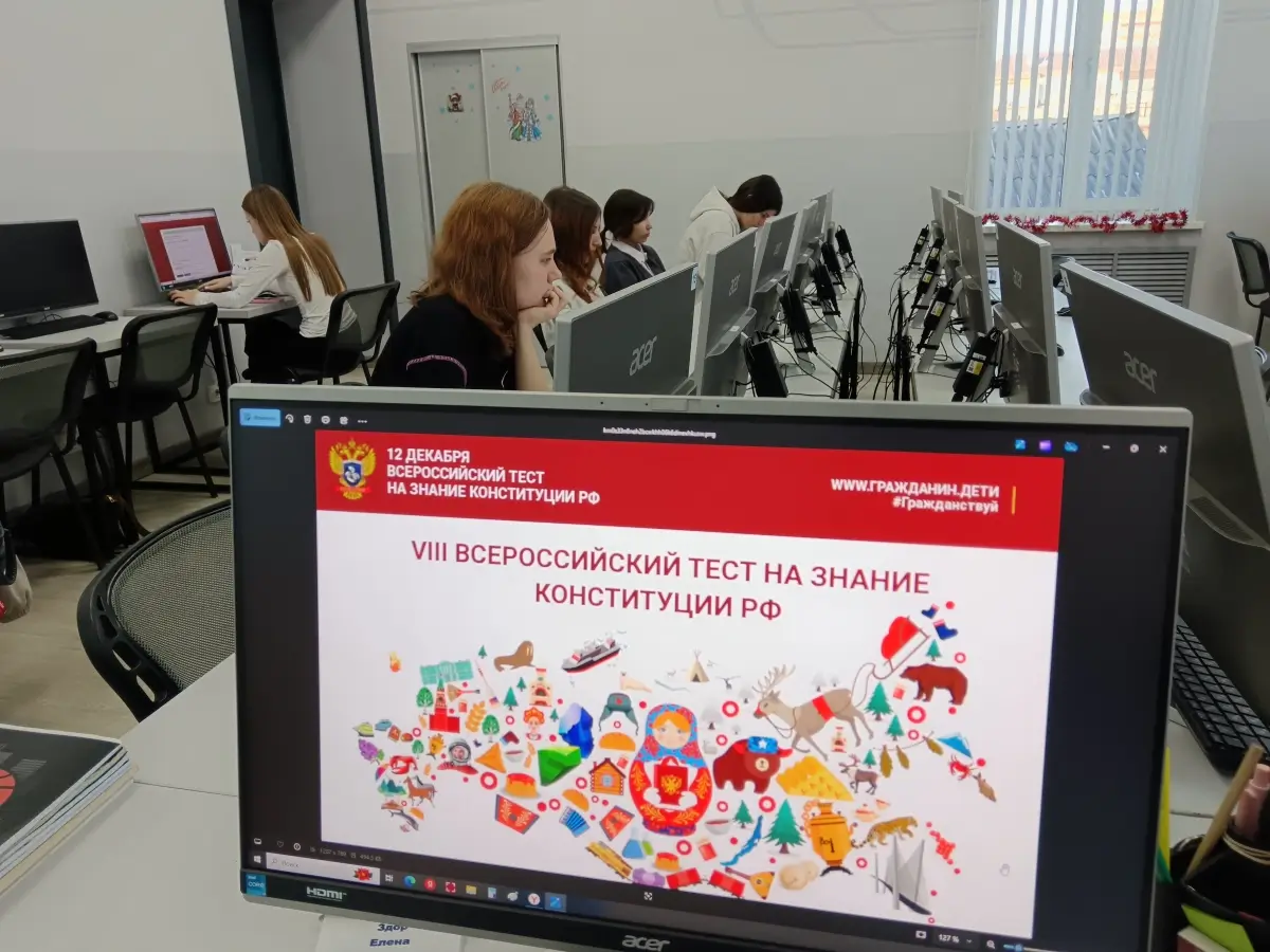 Кроме того, в стенах колледжа прошло тематическое тестирование - X всероссийский тест на знание Конституции РФ. Студенты 121 и 131 групп вместе преподавателем Андреевой Е.В. отвечали на вопросы об основах конституционного строя, правах и свободах человека и гражданина, а также о структуре государственной власти.